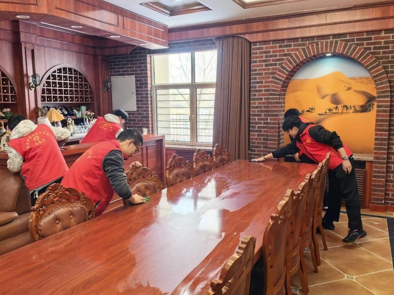 清扫过程中,志愿者们仔细擦拭实验设备,细心清扫地面,认真擦拭门窗玻璃,有序整理各类物品,将废弃杂物分类清理、统一搬运。大家不怕脏、不怕累,不放过任何一处卫生死角,用认真细致的态度守护着实训环境。
