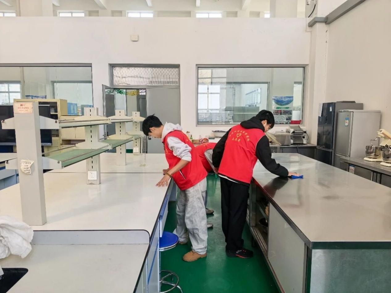 活动当日,志愿者们早早集合,身着红马甲,带着精心准备的清洁工具,满怀热忱地来到食品工程技术中心。这里是学院实践教学的重要场所,承载着专业学习与实验操作的重要功能,每一台设备、每一处角落都关系着学习与实训的正常开展。志愿者们明确分工、各司其职,认真投入到清扫工作中。
